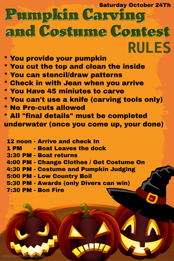 Under water pumpkin carving, costume contest, low country boil with amazing prizes!