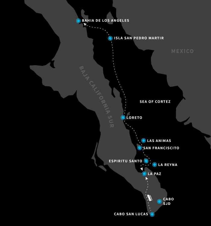 The Sea of Cortez, named “The Aquarium of the World” by none other than Jaques Cousteau, is a breathtaking part of the Pacific, situated between mainland Mexico and the Baja California peninsula. The sea stretches for nearly 1100 miles from Cabo San Lucas in the south almost to the US border in the north. It is almost as long as the west coast of the US but the average width of the sea is only 50-75 miles.